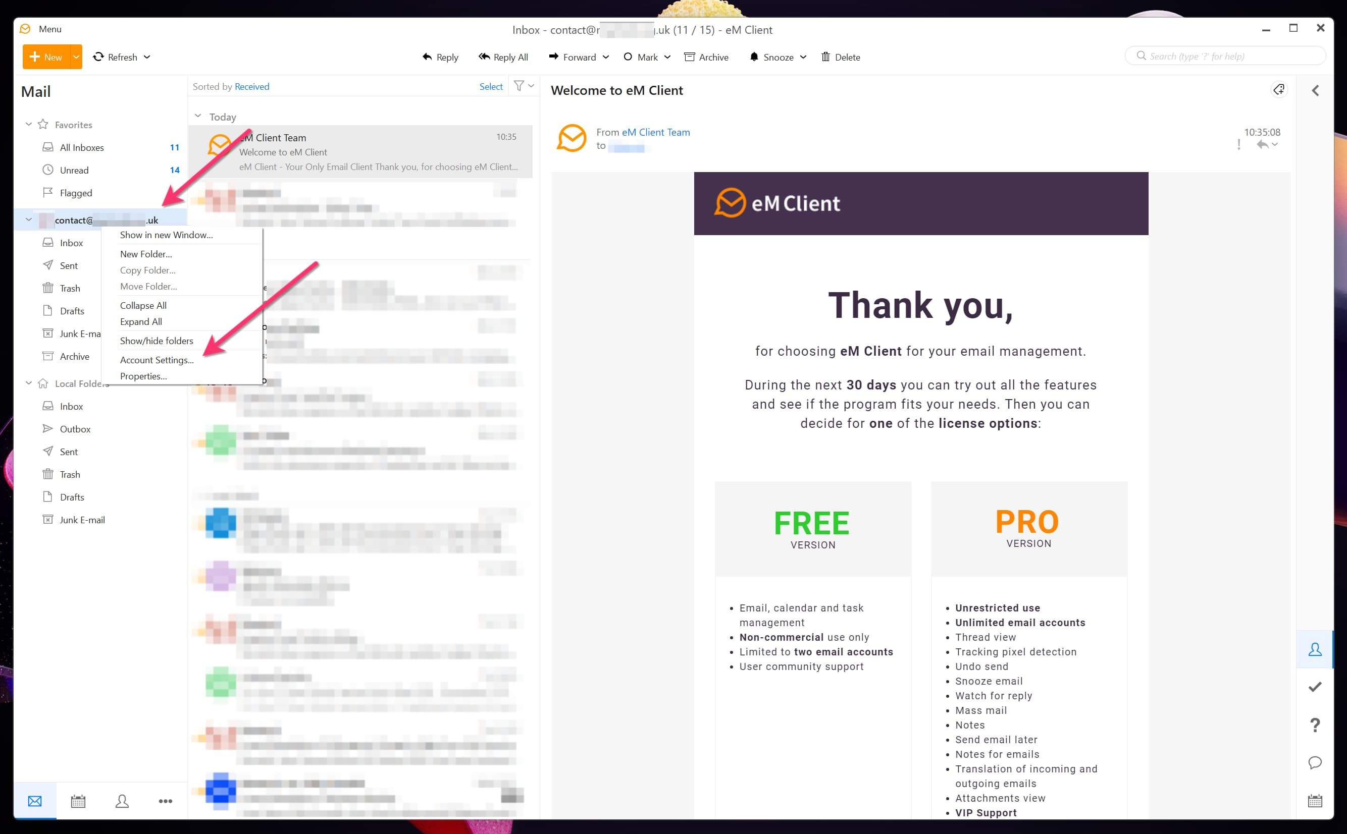 You may have been directed by us or your hosting provider to update your incoming and outgoing email server settings. This guide walks you through how to do this in eM Client on Windows desktop for an existing account that has already been added to eM Client.