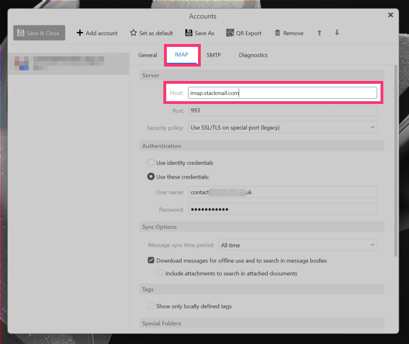 Step 2: A pop-up will appear. Click on the "IMAP" tab and change the "Host" field:
